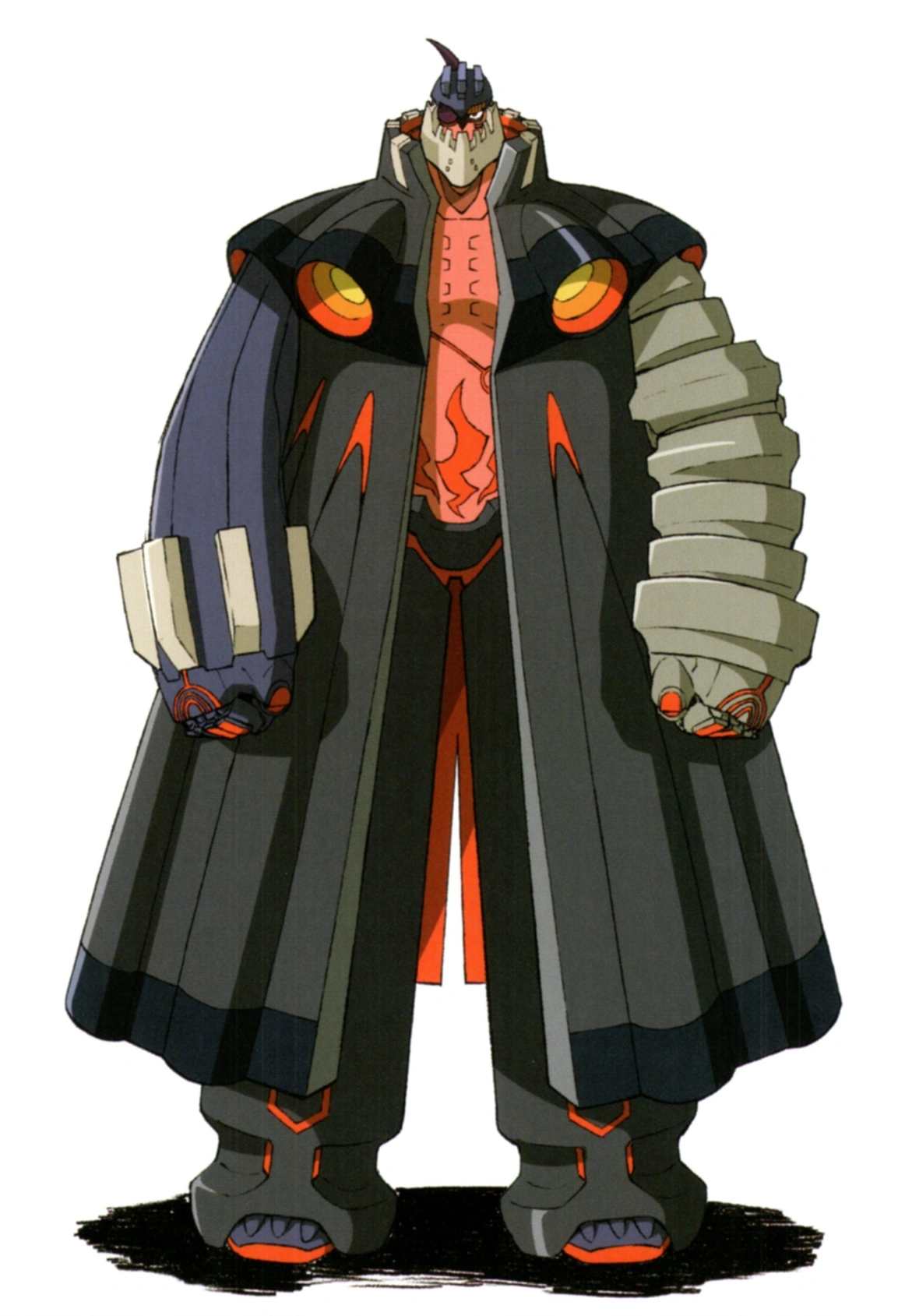 Dix-Neuf is a large, brooding mecha-humanoid, even believed to be semi-organic. Most of Dix-Neuf's torso and lower body is covered by a large, dark blue trench coat-like piece of armor. Gunbuster's torso is orange and supposedly fleshy, as the hull of his torso is striped with many scars from previous battles with Space Monsters. When Dix-Neuf's coat is taken off, a bronze carving reminiscent of a Japanese Oni demon lies upon Dix-Neuf's back. This carving is activated whenever Dix-Neuf's pilot achieves their topless form, which will cause blue ethereal flames to burst from the carving's head in the shape of horns, complementing the Oni design and allowing the carving to emit multiple Buster Beams. Dix-Neuf has a set of two long arms, with his left being his organic arm and right being a robotic limb implant, as his right arm was severed in a previous attrition.