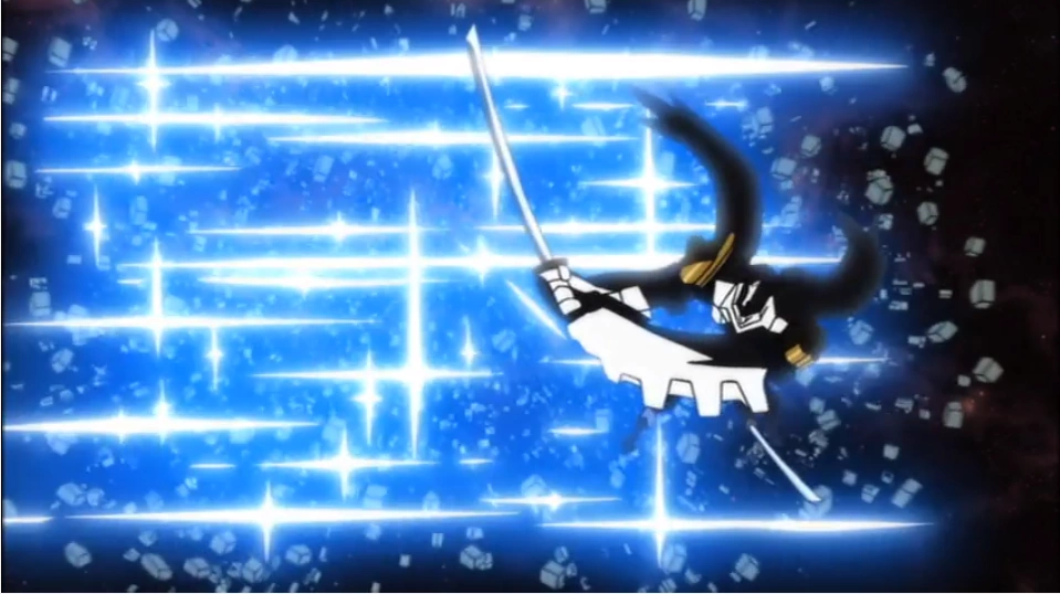 The Buster Machine has a sword that it can use to cut enemies into many smaller pieces, though it only looks like it has cut the enemy once. This is similar to techniques samurai characters sometimes use in anime. The pieces then explode. Nicola uses this to defeat the aforementioned space monster.